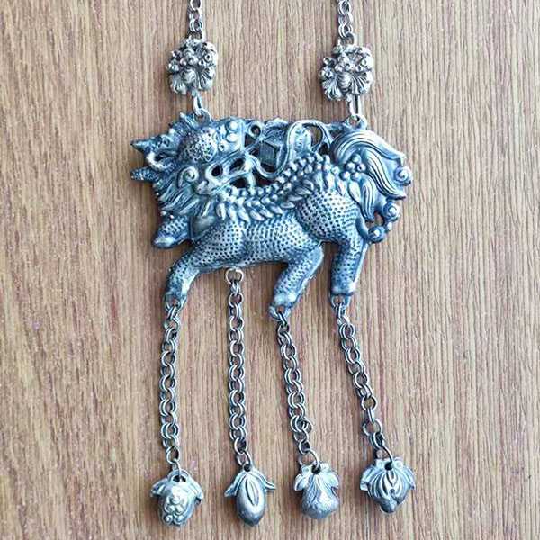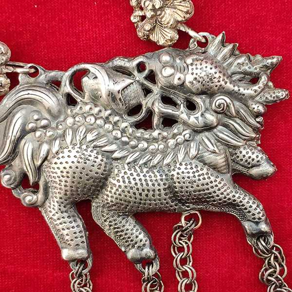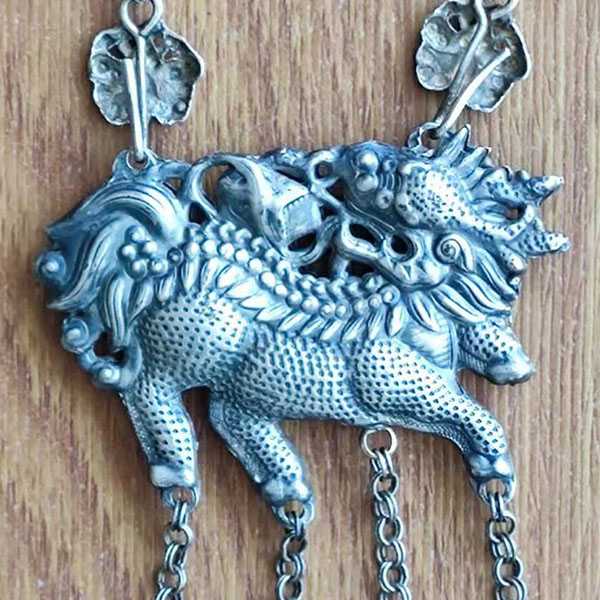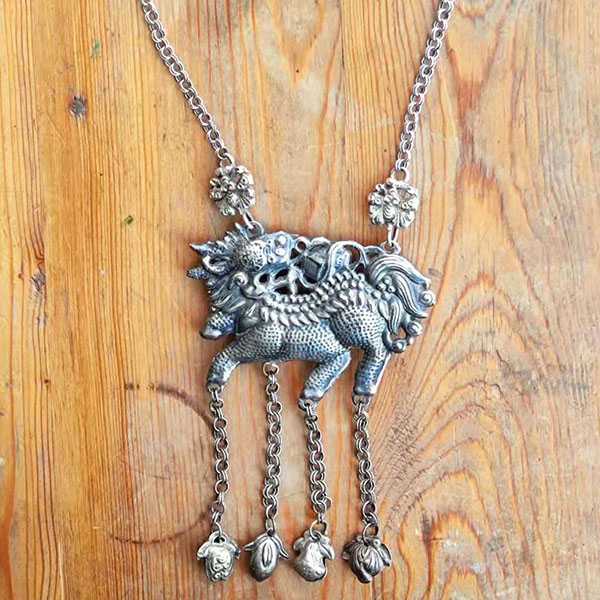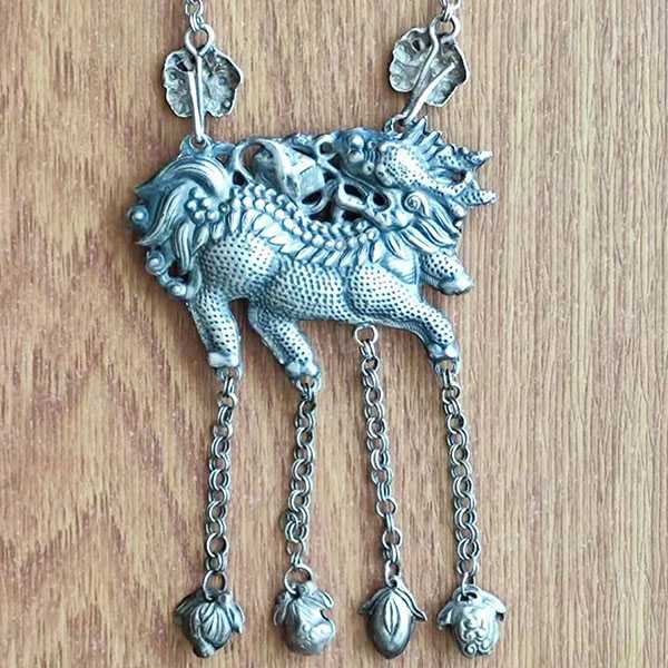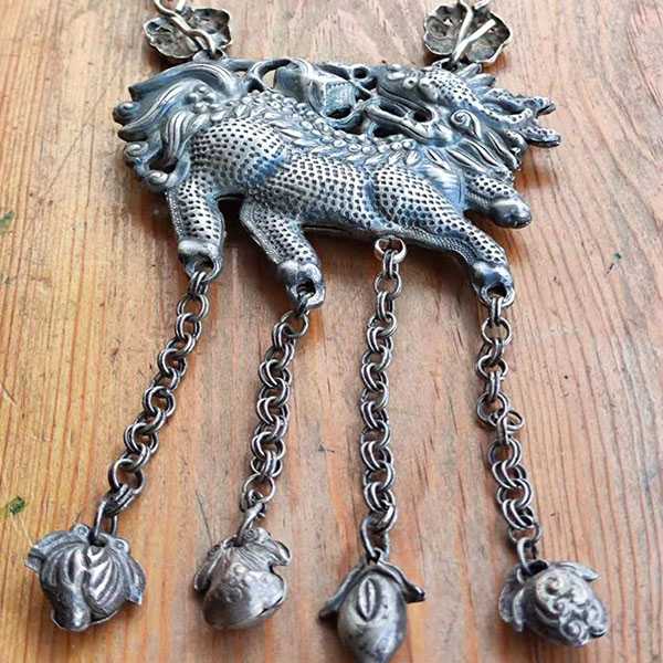此麒麟长命锁银挂件为纯手工精制而成,银质纯正,工艺精湛,设计古朴,包浆自然厚重。其造型为麒麟回首顾盼,神态生动传神,饰以佛手、石榴和蟠桃流苏,寓意多福多寿多子、吉祥富贵,具有辟邪开运、镇宅化煞和祈福纳吉的风水理气功效 。