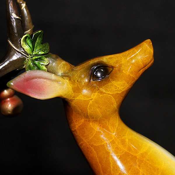 此全铜福鹿高升摆件选用62国标新铜,纯手工精制而成,设计精美,细节考究,色泽鲜艳,线条流畅,纹理细腻,精雕细琢,高温烧色不褪色,手感润泽而有层次感。其造型为神鹿阔步欲跃,神态生动,身姿矫健,富有动感,寓意健康长寿、美满幸福,具有辟邪化煞、招财旺运和祈吉纳福的风水理气功效。
