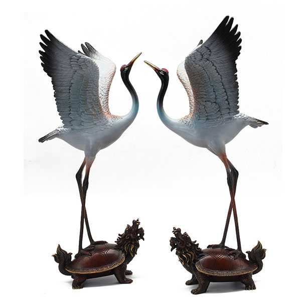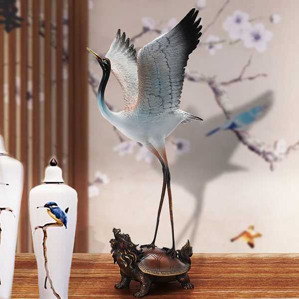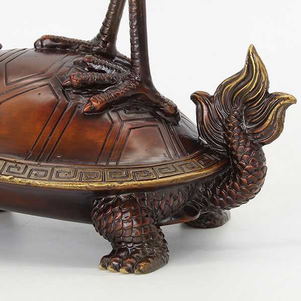 此全铜龟鹤延年摆件选用62国标新铜,纯手工精制而成,设计精美,细节考究,色泽鲜艳,线条流畅,纹理细腻,精雕细琢,高温烧色不褪色,手感润泽而有层次感。其造型为仙鹤脚踏龙龟,昂首振翅,神态生动,身姿矫健,富有动感,寓意延年益寿、美满幸福,具有辟邪化煞、招财旺运和祈吉纳福的风水理气功效。