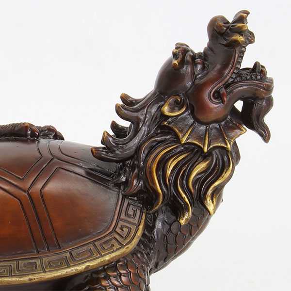 龙龟,也称霸下、赑屃,是一种瑞兽,相传为龙生九子之一,其形头尾似龙,身形似龟,好负重,长年累月地驮载着石碑。龙龟是权利地位和长寿吉祥的象征。龙龟既有龙的威武刚强,亦有龟的忍辱负重阴柔,故民间风水界,一向以来皆以龙龟为风水理气的圣品,其力量除了化解太岁、是非口舌及各种形煞外,也有镇宅平安、招财迎福之功效。 龙头朝向门户,可招财纳福,龟尾、龟背向外,以挡冲煞之气。