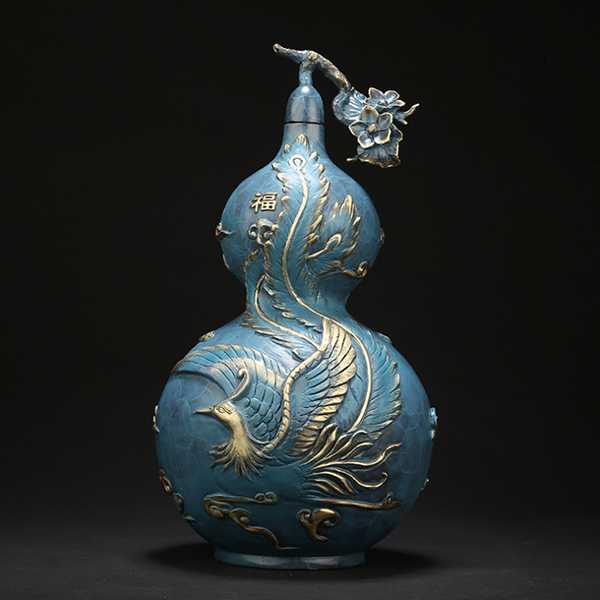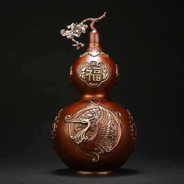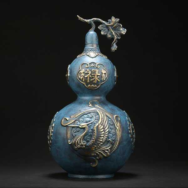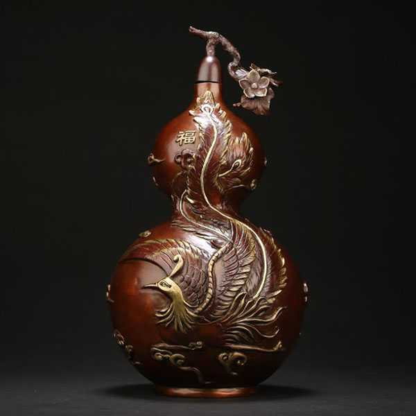 此全铜葫芦摆件选用62国标新铜,纯手工精铸而成,设计独特,手感细腻厚重,色泽饱满,高温烧色工艺不褪色。其葫芦造型外表雕刻祥龙瑞凤和福禄纹饰,寓意大度能容、厚德载物。