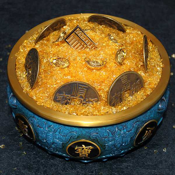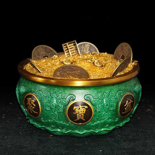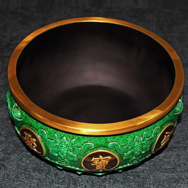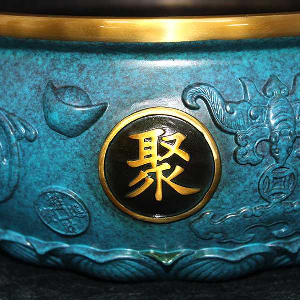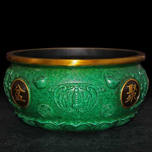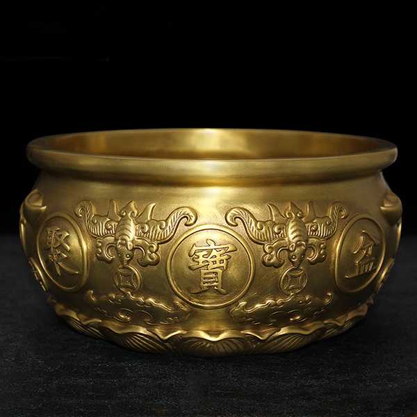 此全铜金玉满堂聚宝盆摆件选用62国标新铜,纯手工精制而成,设计精美,细节考究,精雕细琢,高温烧色不褪色,手感润泽而有层次感。其造型口大肚圆,外壁雕刻蝙蝠纹饰,寓意财源广进,聚气积福,将其放置于家宅中财位,具有催旺财运,聚集生气,广纳财源的风水理气功效。