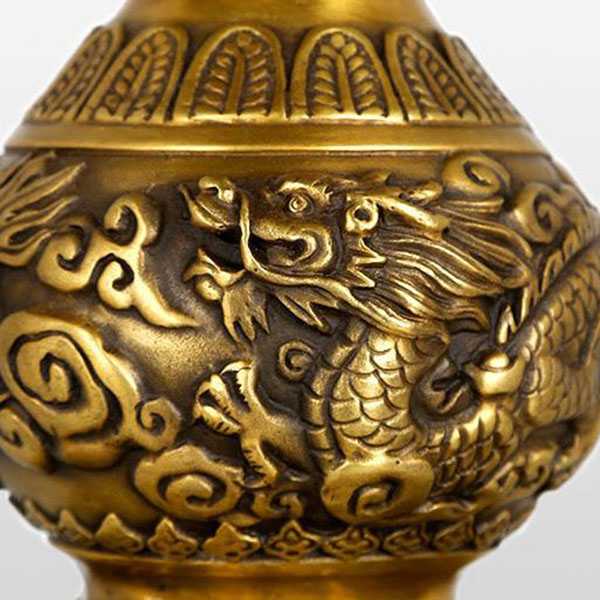 此全铜龙纹葫芦摆件选用62国标新铜,纯手工精铸而成,设计独特,手感细腻厚重,色泽饱满。其葫芦造型外表雕刻祥龙纹饰,寓意祥瑞如意,祈福纳吉,招财晋禄。