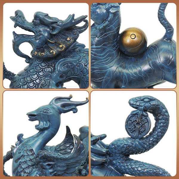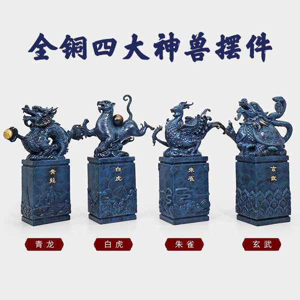 此全铜四大神兽摆件选用62国标新铜,纯手工精制而成,设计精美,细节考究,精雕细琢,高温烧色不褪色,手感润泽而有层次感。其造型为青龙、白虎、朱雀和玄武四大神兽,神态生动,寓意祥瑞平安,富贵长寿,具有辟邪、化煞和开运的风水理气功效。