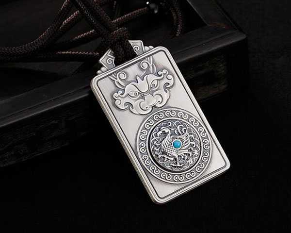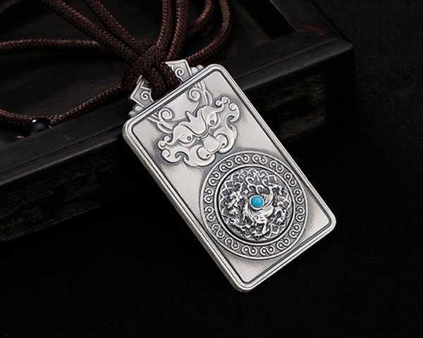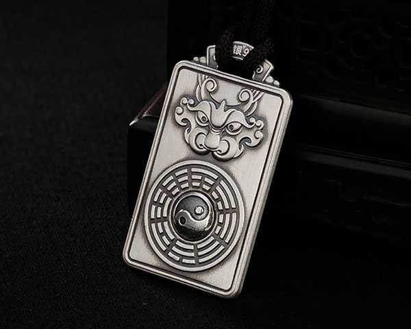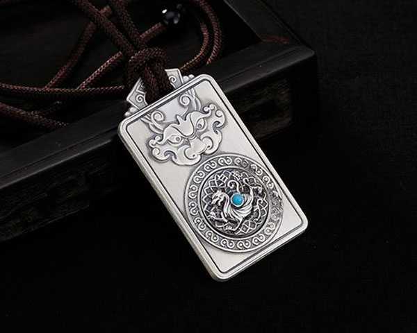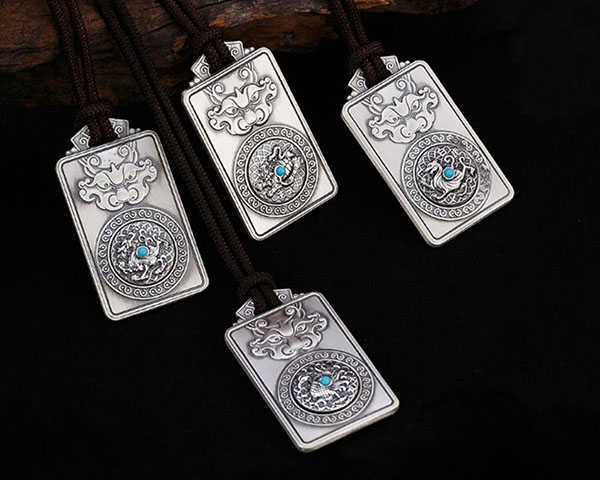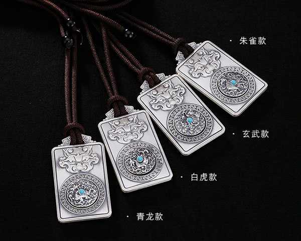 此纯银四大神兽吊牌选用999足银纯手工精制而成,色泽光滑不易氧化,正面雕刻四大神兽图案,背面为八卦太极图。青龙、白虎、朱雀、玄武对应五行木、金、火、水,分别镇守东西南北四宫,“辟邪恶、调阴阳,为四方之神”。