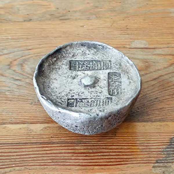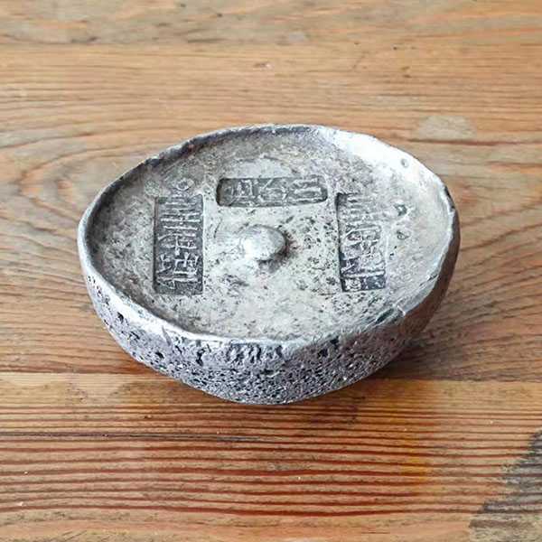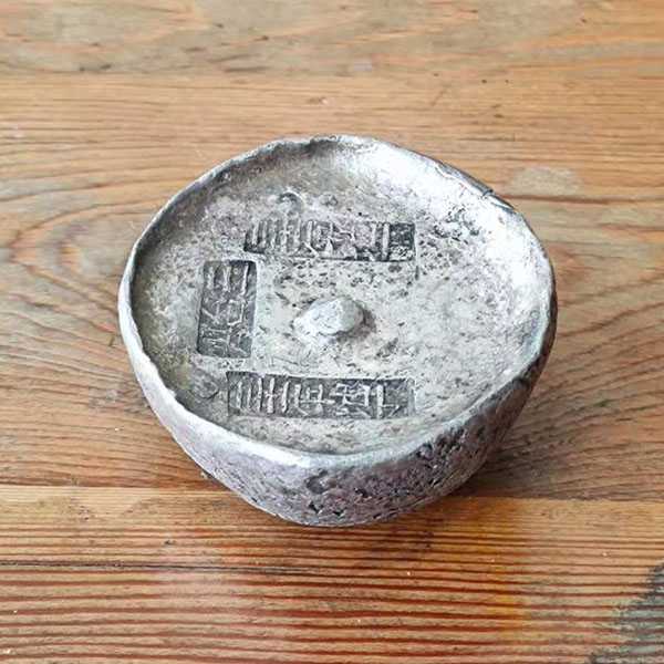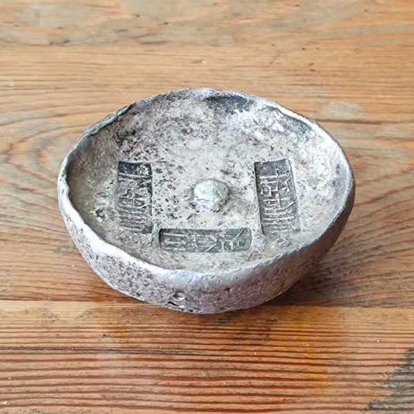 此四川三合县三十一年地丁三戳十两银锭为足银铸造,造型呈椭圆形碗状,铸造精良,光泽温润,成色极佳,正面印“三台县”及双排“三十一年地丁”字样戳记,打戳规整清晰,保存完好,原味包浆自然厚重,品相一流。