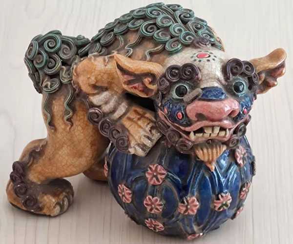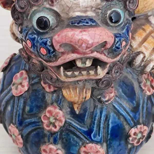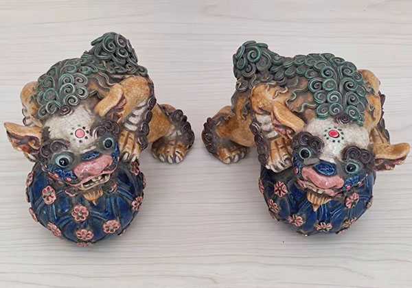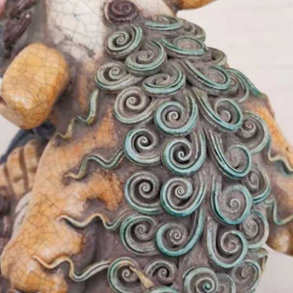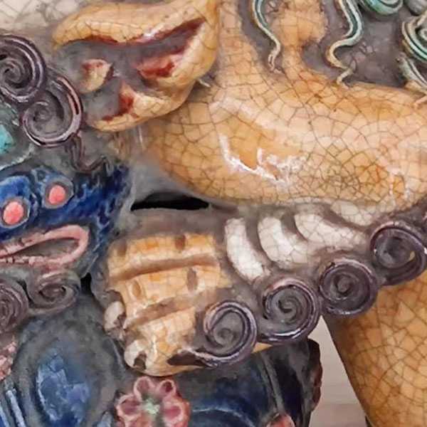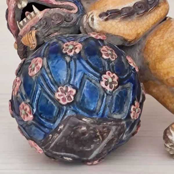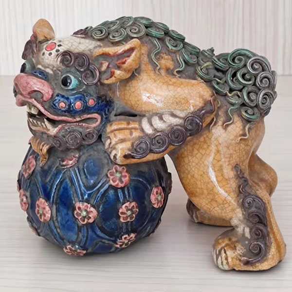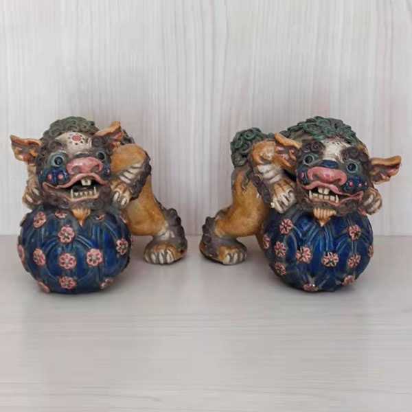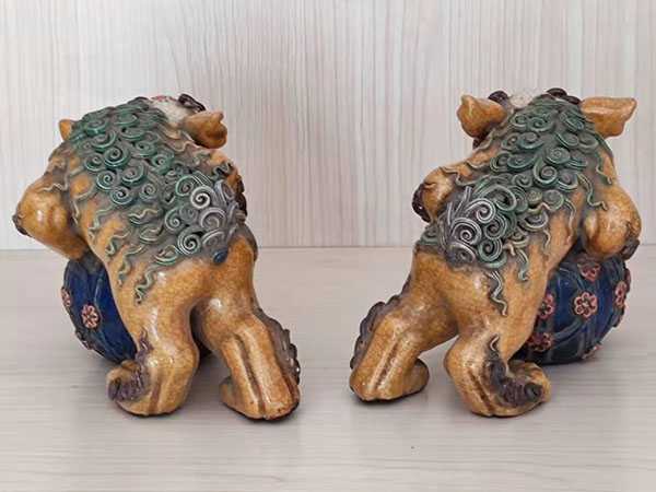 此石湾窑双狮滚绣球摆件为纯手工捏雕而成,工艺复杂精美,釉色肥润,釉面纹片均匀,包浆厚重老道。其造型为狮子脚踩绣球,神态生动,活灵活现,寓意喜庆欢乐、富贵吉祥、祛灾祈福。狮子性格凶猛,煞气较重,风水理气中常用于镇宅辟邪,能带来祥瑞之气,消除各种灾祸。