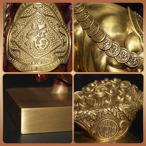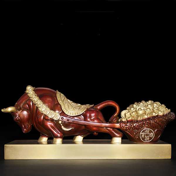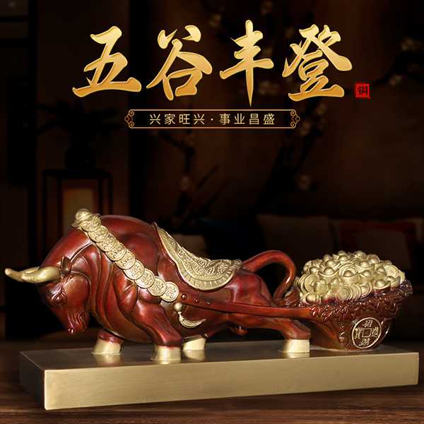 此五谷丰登铜牛摆件选用62国标新铜,纯手工精制而成,设计精美,细节考究,精雕细琢,高温烧色不褪色,手感润泽而有层次感。其造型为牛车满载钱宝蓄势待发,其神态生动,线条刚劲雄浑,富有力量感,寓意五谷丰登、事业昌盛、财源通享、运势如虹,具有招财旺运和祈吉纳福的风水理气功效。