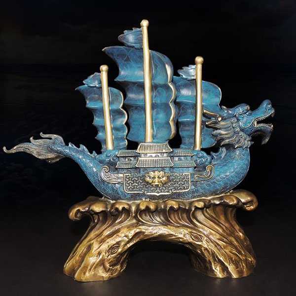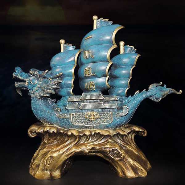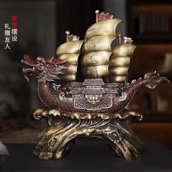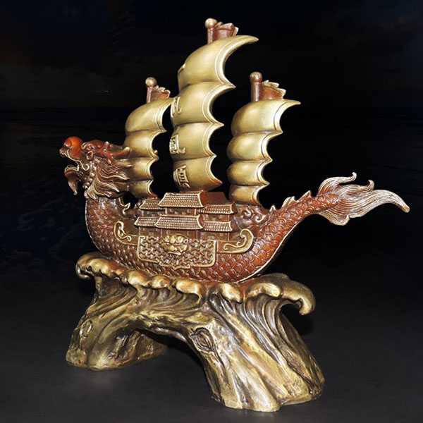 此全铜一帆风顺龙船摆件选用62国标新铜,纯手工精制而成,设计精美,细节考究,精雕细琢,高温烧色不褪色,手感润泽而有层次感。其造型为龙船扬帆起航,寓意一帆风顺,心想事成,万事顺意。