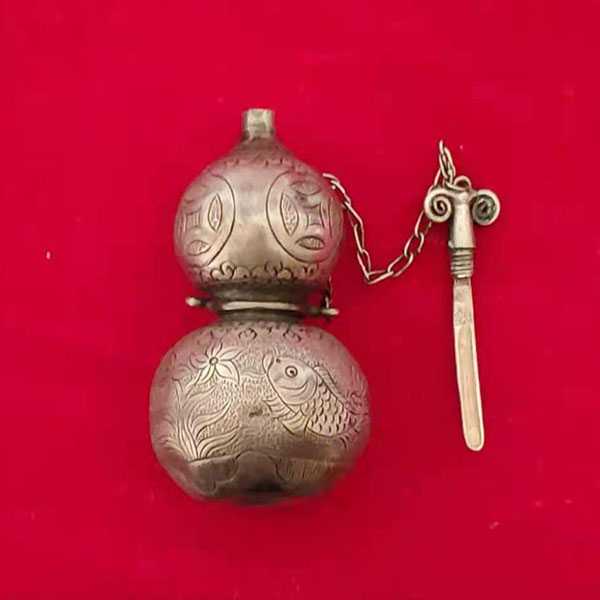 此银葫芦挂件为纯银手工精制而成,纯度高银色正,雕刻工艺细致,纹饰清晰传神,包浆自然,腹藏耳采,设计精巧。其表面雕刻有莲花、金鱼和五帝钱纹饰,寓意招财进宝、辟邪开运。