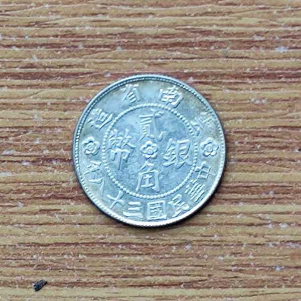 此云南省造中华民国三十八年贰角银币打制清晰,压力均匀深厚,图案文字清晰完整,底版细腻亮洁,光感十足,品相上佳,极具收藏价值。此币正面珠圈内为“贰角银币”,中间有一朵梅花,珠圈上方为“云南省造”,下方为“中华民国三十八年”。背面的小房子为抗战胜利纪念堂 ,原为清朝云贵总督衙门,故此币在《中国银币目录》中也称为"云南省府大厦图银币”。