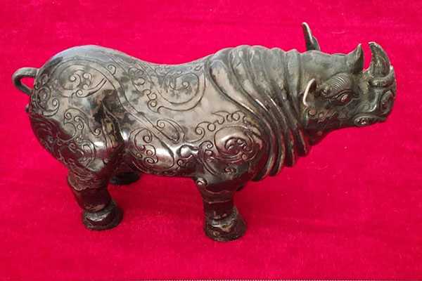 犀牛作为陆地上第二大动物,性格凶猛,体格强壮,寓意沉着稳重。据《蜀王本纪》、《华阳国志.蜀志》等史料记载,秦朝的蜀守李冰在修建都江堰时,命人打制五头石犀牛作为镇水瑞兽。犀牛五行为丑土,传说中犀牛是具有分水、镇水煞功能的神兽,其角无坚不摧、所向披靡,具有辟邪化煞的功效。