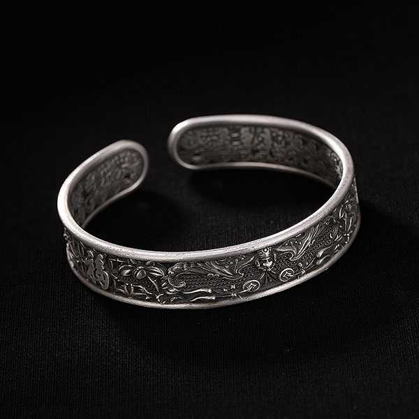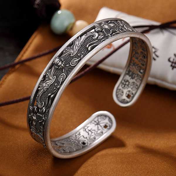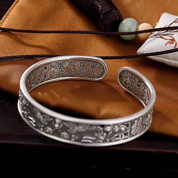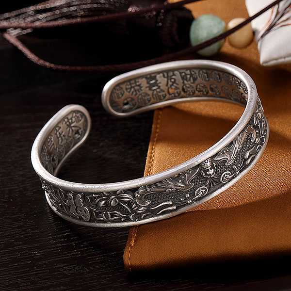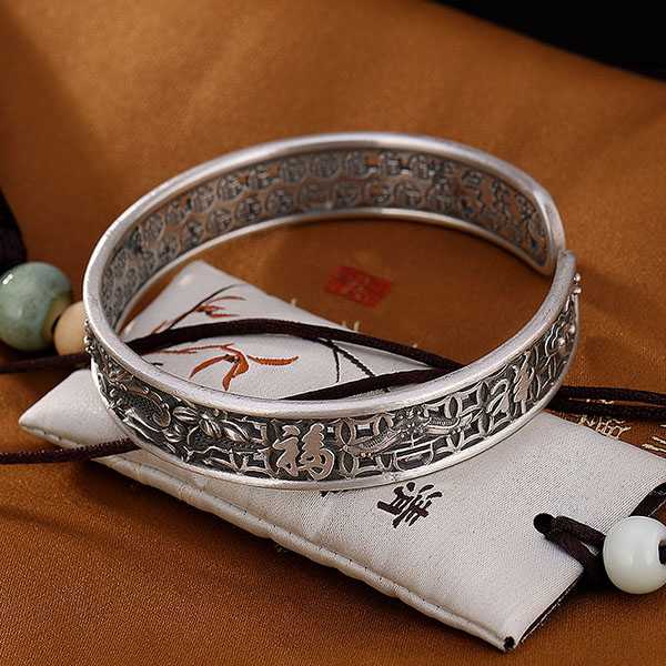 此足银蝙蝠祥云手镯选用S999足银,纯手工精制而成,银质纯净、光洁细腻,纹饰图案细致,设计精美别致。其表面雕刻蝙蝠纹饰,寓意祥瑞如意,具有祛邪避灾、祈福纳吉的风水理气功效。