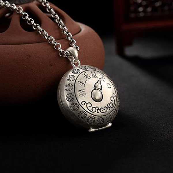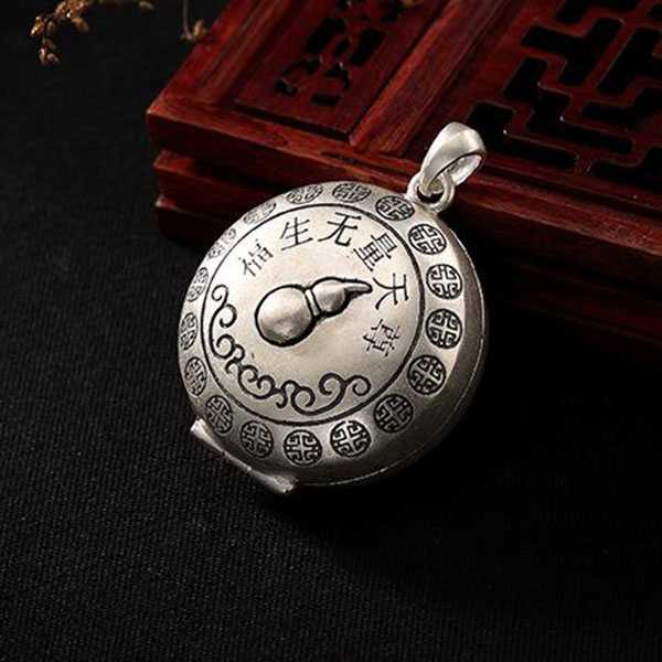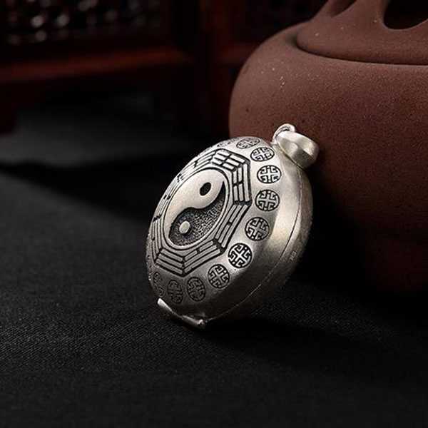 此足银八卦法器符咒盒吊坠选用S990足银,纯手工精制而成,银质纯净、光洁细腻,字迹笔画清晰均匀,设计精巧可打开,密封性好适用于存放符咒,便于贴身携带。其正面为太极八卦图案,背面雕刻葫芦图案及“福生无量天尊”字样,具有辟邪化煞、开运护身之功效。