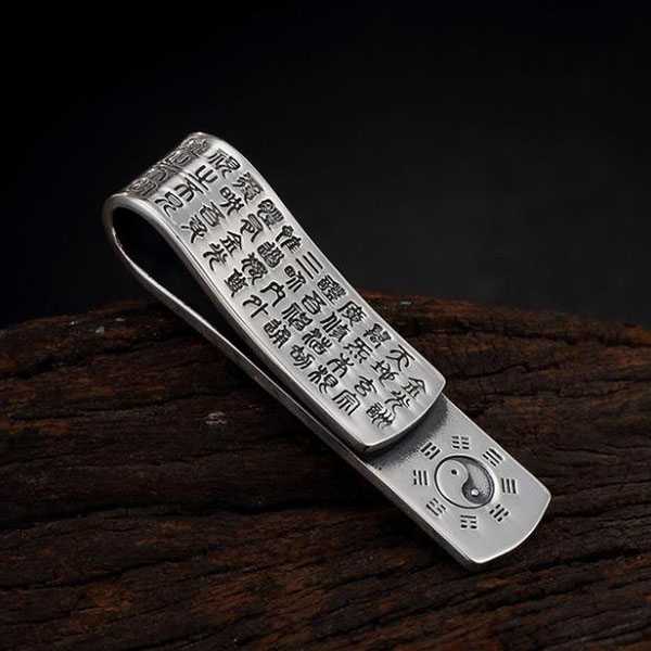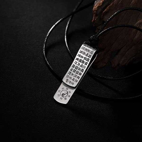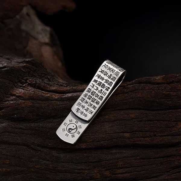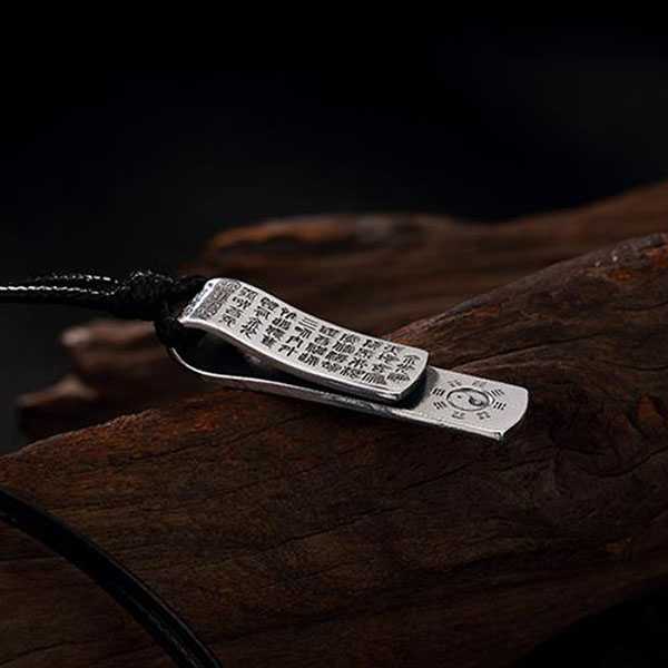 此足银金光咒八卦吊坠选用999足银纯手工精制而成,色泽光滑不易氧化,银质纯净、光洁细腻,字迹笔画清晰均匀,表面雕刻太极八卦图案及道教金光咒,具有辟邪化煞、开运护身的风水理气功效。