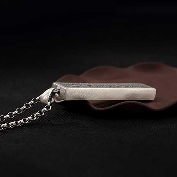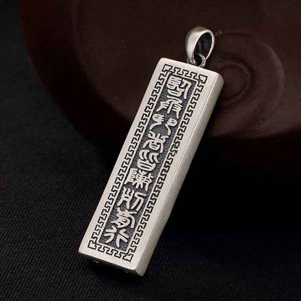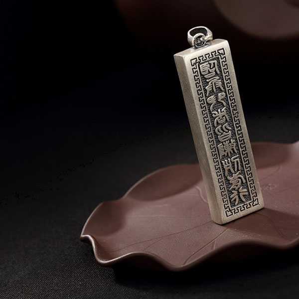 此足银九字真言吊坠选用S990足银纯手工精制而成,色泽光滑不易氧化,银质纯净、光洁细腻,字迹笔画清晰均匀,表面雕刻道教九字真言,具有辟邪化煞、开运护身的风水理气功效。